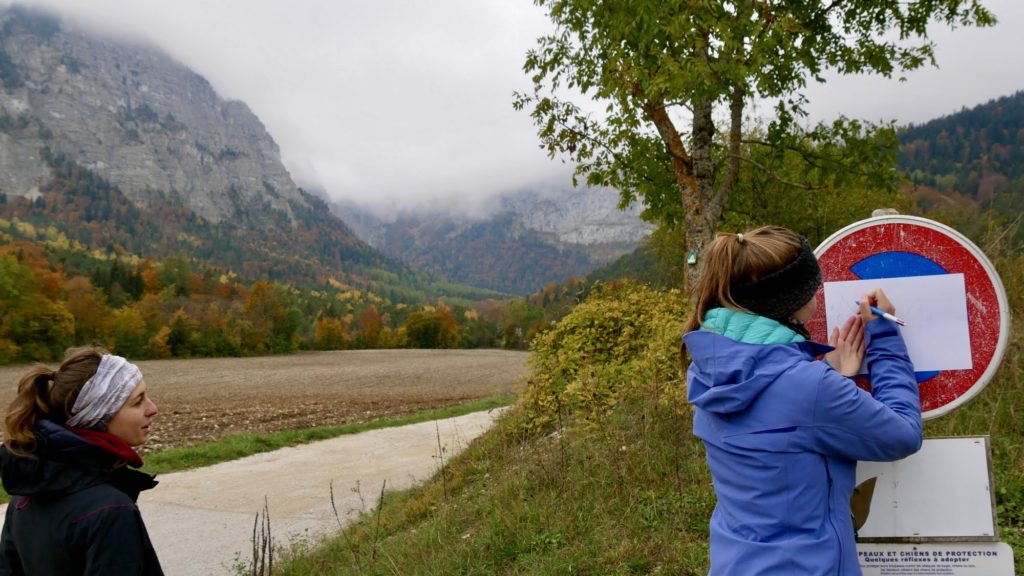 Nous entamons ensuite la formation à l’orientation. Vincent et Bruno nous expliquent les fondamentaux de la lecture de carte. Nous nous associons par deux pour le premier exercice : dessiner le paysage à partir de la description faite par son binôme. L’objectif : apprendre à observer son environnement et appréhender les enjeux de la cartographie. Sans crier au génie nos dessins sont plutôt satisfaisants…