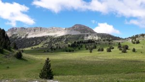 Direction le Sud Vercors . Cette traversée offre une vue bien sympathique sur un sommet mythique : le Mt Aiguille, et l’étendue des Hauts Plateaux