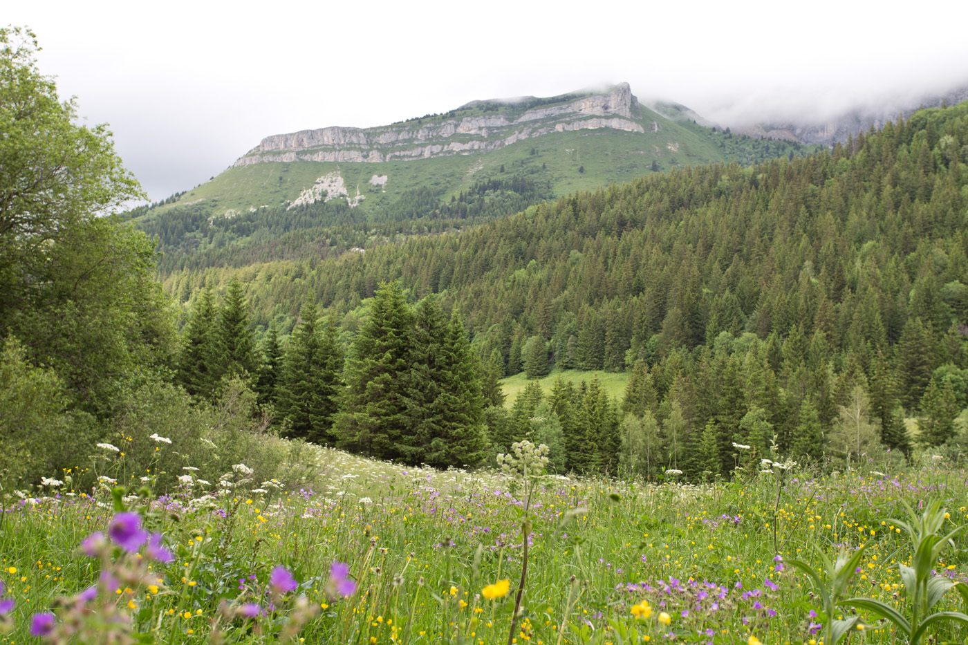 Des montagnes tout autour qui nous font face : d’un côté le regard capte la grandeur : une montagne minérale toute de roche, d’à-pics et de sommets gris et de l’autre, plus en douceur, en courbe et en ronds, des sommets aux couleurs végétales, aux branches et aux écorces généreuses. […]
