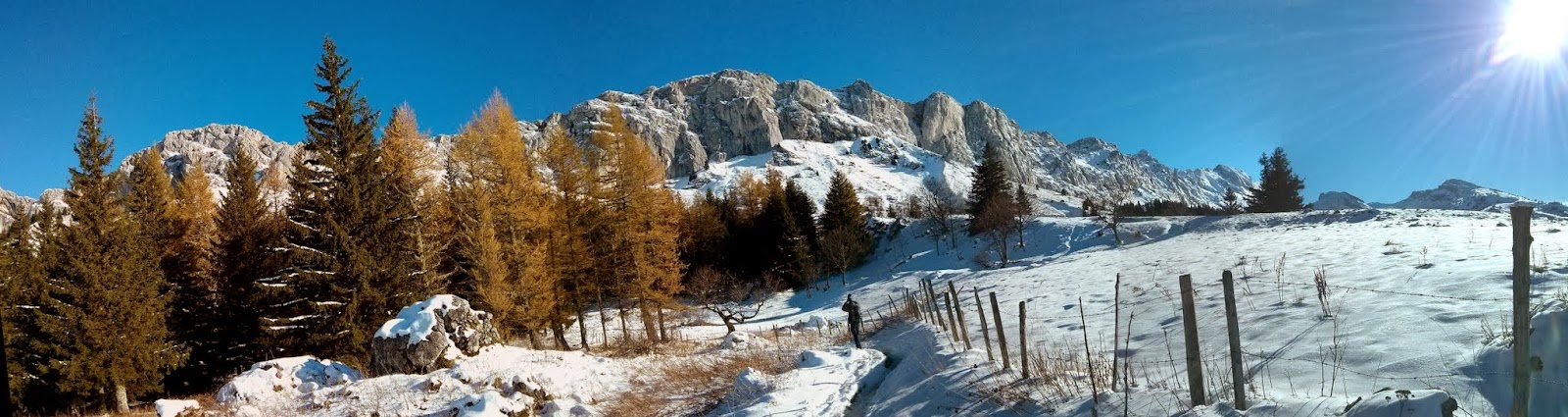 On monte ensuite progressivement en forêt, d’abord dans les nuages, pour arriver au Col Vert, avec de la neige sur le haut du parcours. Un troupeau de mouflons en contrebas.
