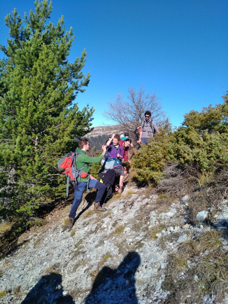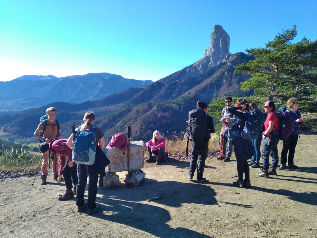 Encore une rando écolo, 100% sans voiture au départ de Grenoble:) ! Nous avons pris le bus samedi matin en direction de Mens pour rejoindre le départ de la randonnée à Saint-Michel-les-Portes. De là nous avons grimpé au cœur du bois de la Fayolle, avec quelques portions assez raides notamment sous quelques falaises de calcaire peu propices à la pause. Nous sommes ensuite arrivés au col de Papavet, presque 500 m plus haut que notre point de départ. De là, la vue sur le Mont-Aiguille est assez impressionnante. On a pu parler de son histoire et observer au même endroit des crottes de loups, si si !
