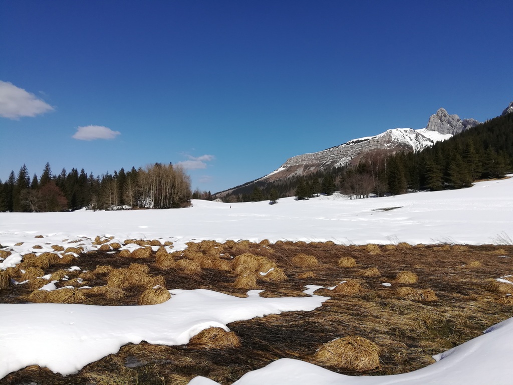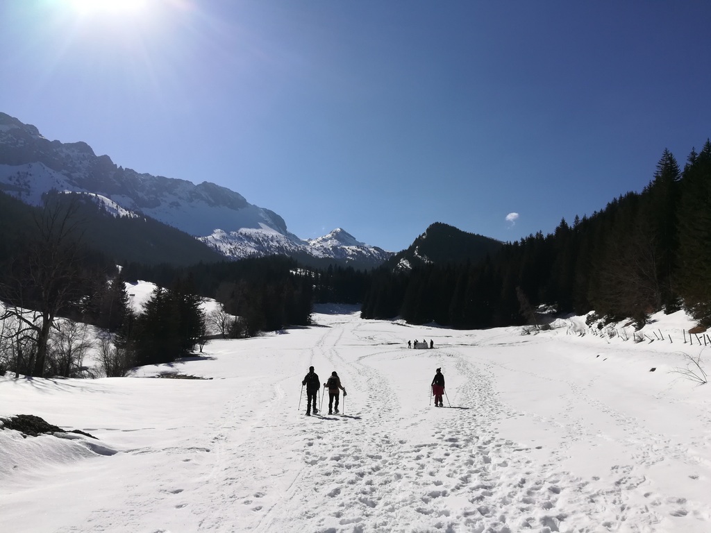 Depuis le village, nous avons rejoint la cascade de Fauge et chaussé les raquettes avant de prendre la direction de la belle prairie de la Fauge offrant un beau panorama vers les falaises du Vercors sous un soleil resplendissant.