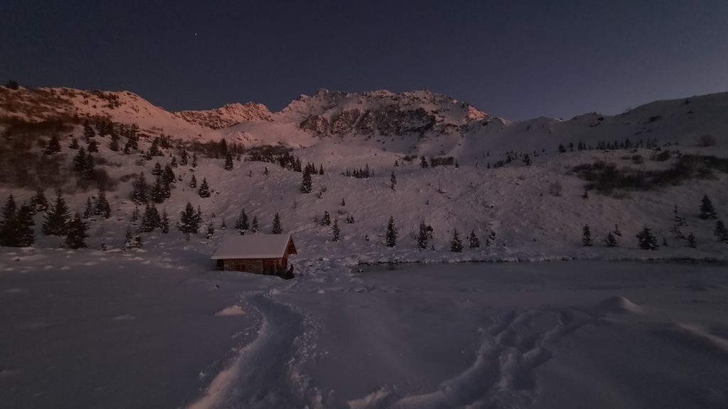 La cabane est près du lac, le blanc émaille les sommets, au loin La Chartreuse et le Vercors, la vue est imprenable. Tout autour le blanc envahi, il tapit tous les coins et recoins. La nuit procure une chevauchée d’étoiles dans le ciel que nous ne nous lassons pas de contempler. Émerveillés que nous sommes par la gracilité des montagnes, de ses constellations et de ses mille trésors dont elle regorge, le temps pourrait durer à l’infini. Nuit étoilée, comme celle de Van Gogh mais sur les plateaux de Belledonne. Savoureux moment autour du poêle, jeux et discussions prolixes.