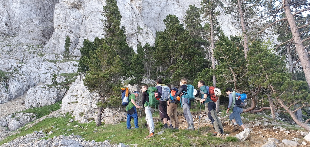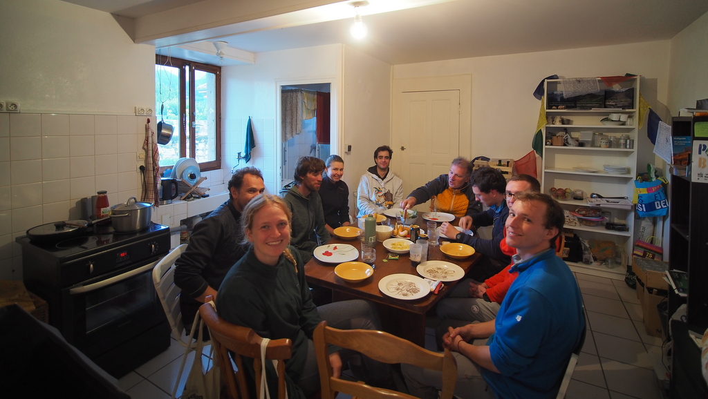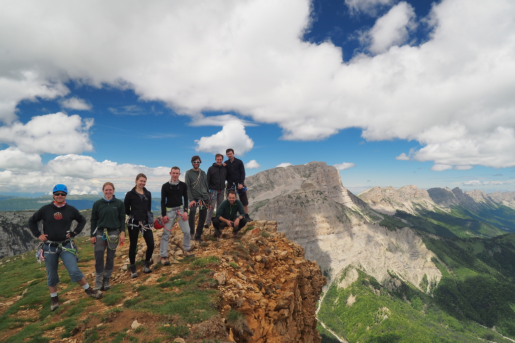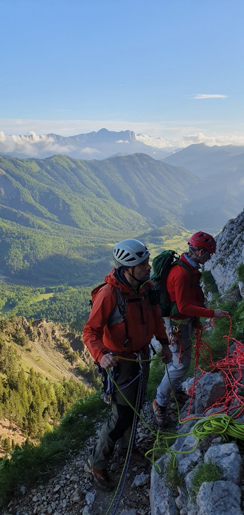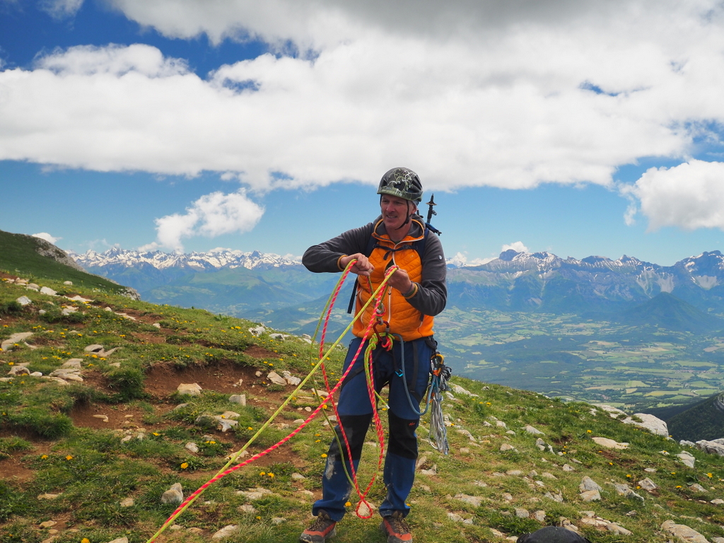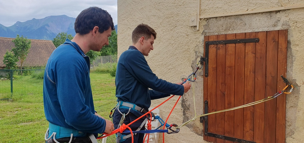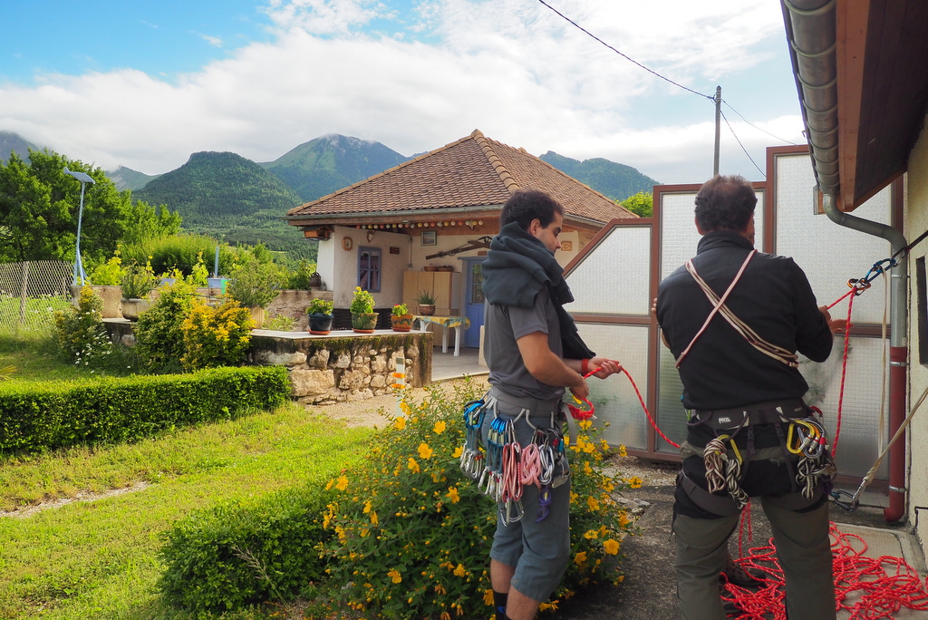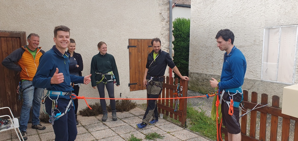 Le samedi après-midi, toute la troupe de participants et des encadrants (François-Luc, Emmanuel et Vincent) s’est retrouvée dans un village à proximité du Mont Aiguille, afin de voir ou réviser quelques techniques et manips de cordes utile pour le lendemain.