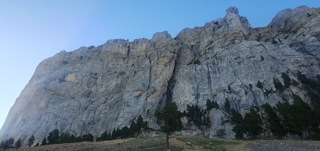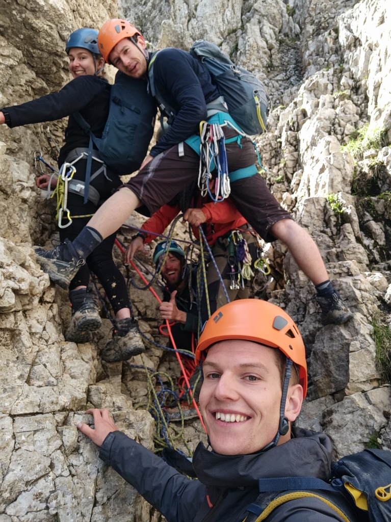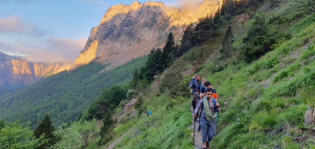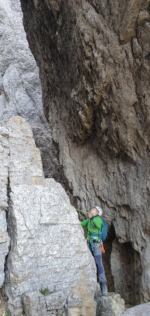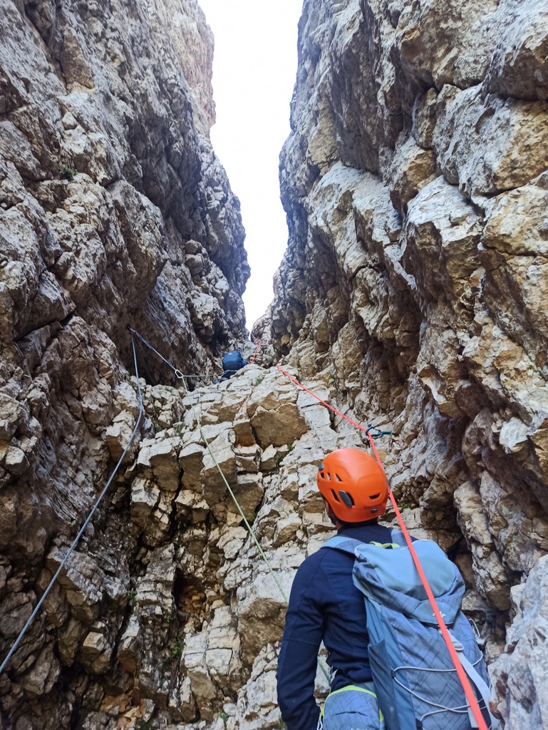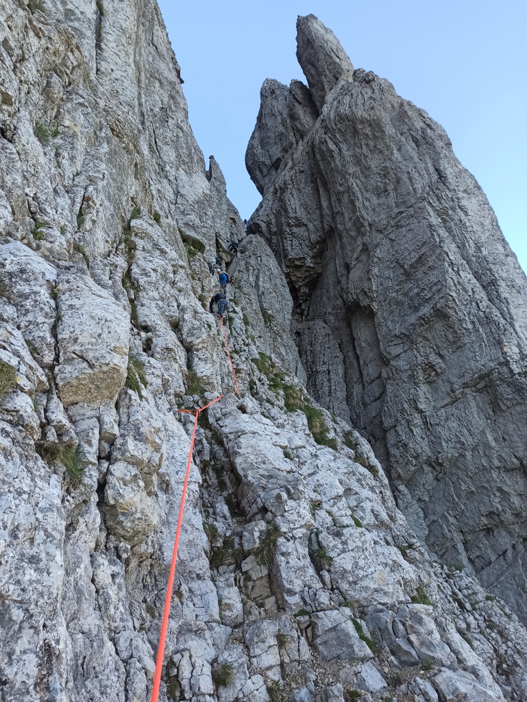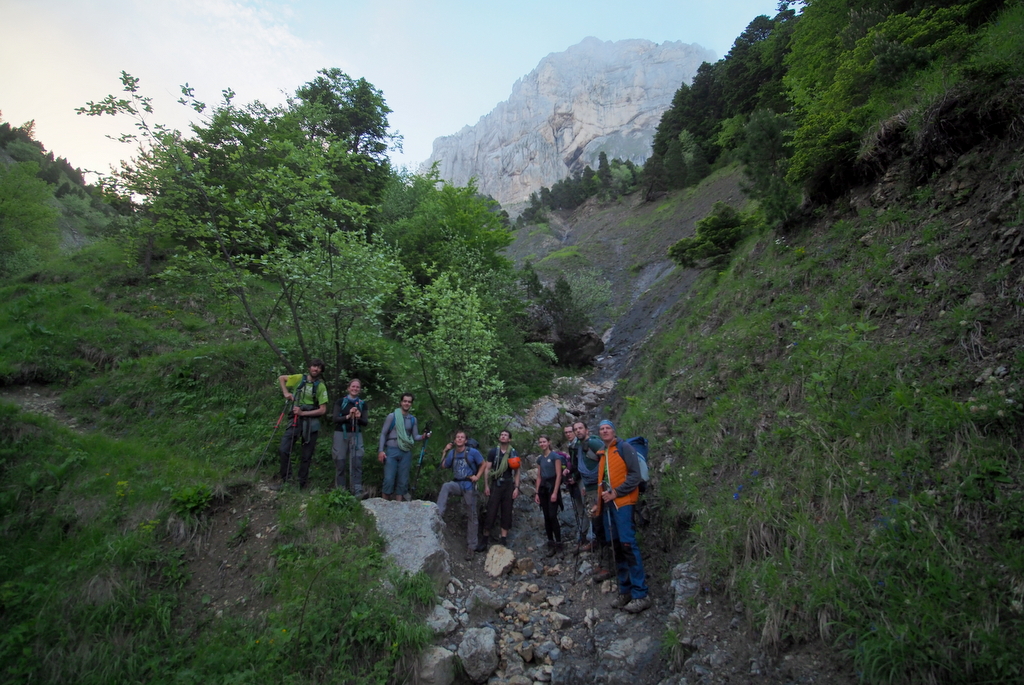 Le dimanche, le départ s’est fait très tôt, alors qu’il faisait encore nuit, pour rejoindre le sentier, au-dessus de la Richardière. Après un peu plus d’1 heure, le pied de la falaise était atteint, et il a donc fallu s’encorder par cordée de 2 ou 3 cordées.