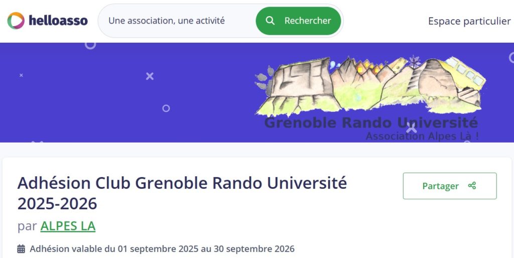 L’adhésion se fait en ligne via la plateforme HelloAsso (paiement sécurisé par carte bancaire, service gratuit pour les associations) avec l’association Alpes-Là qui s’occupe de la gestion du club. - Adhésion Découverte 24-48H Club Grenoble Rando Université : valable pour 1 sortie (1 ou 2 jours) pour découvrir nos activités ou proposer à un-e ami-e de passage de participer à une rando.